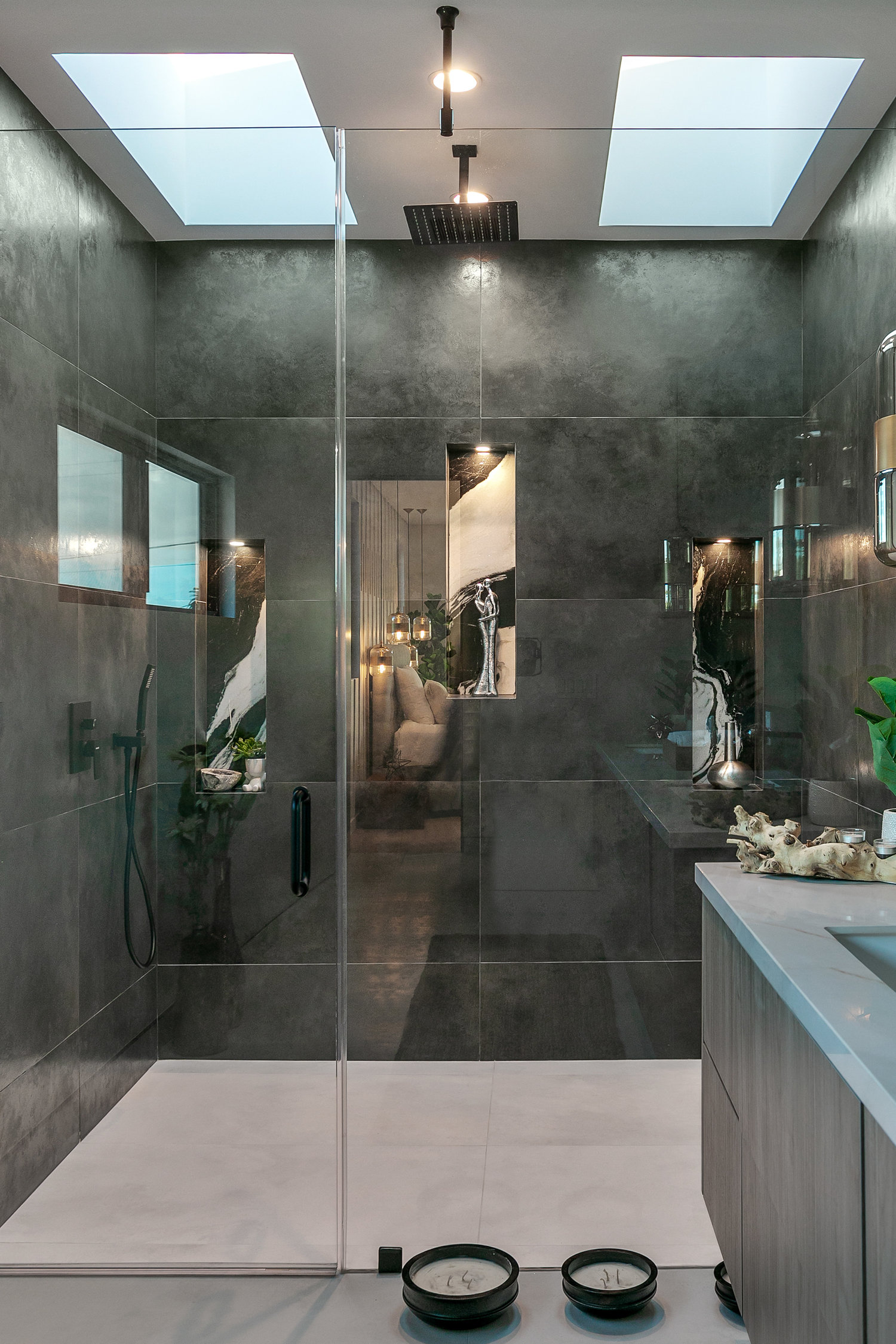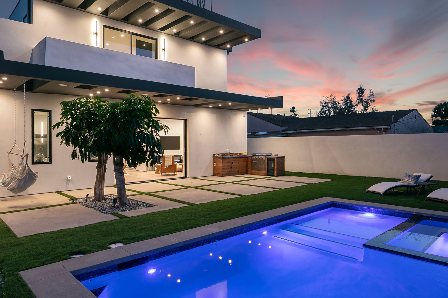 Ascend the striking glass-panel stairs to the rooftop deck, where you’ll be greeted by breathtaking views of the Hollywood sign. This expansive space is equipped with a surround sound system, BBQ kitchenette, and bench seating, offering a private tropical retreat in the heart of Culver City.